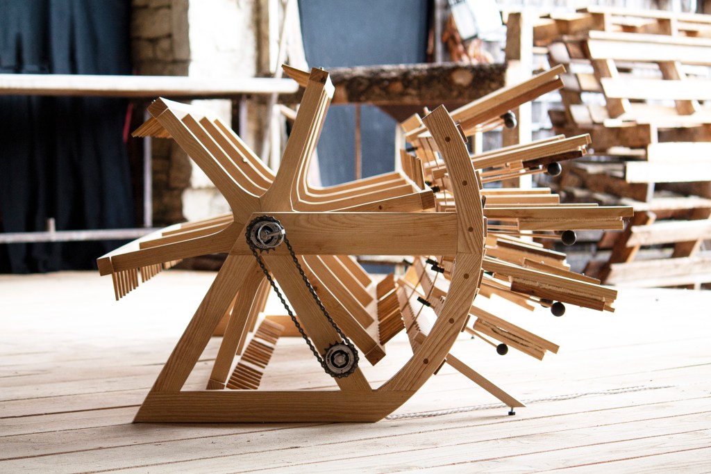 Les mangeux d’terres – 2025oeuvre en cours, assemblage frêne, chêne acier~ 200 x 90 cm